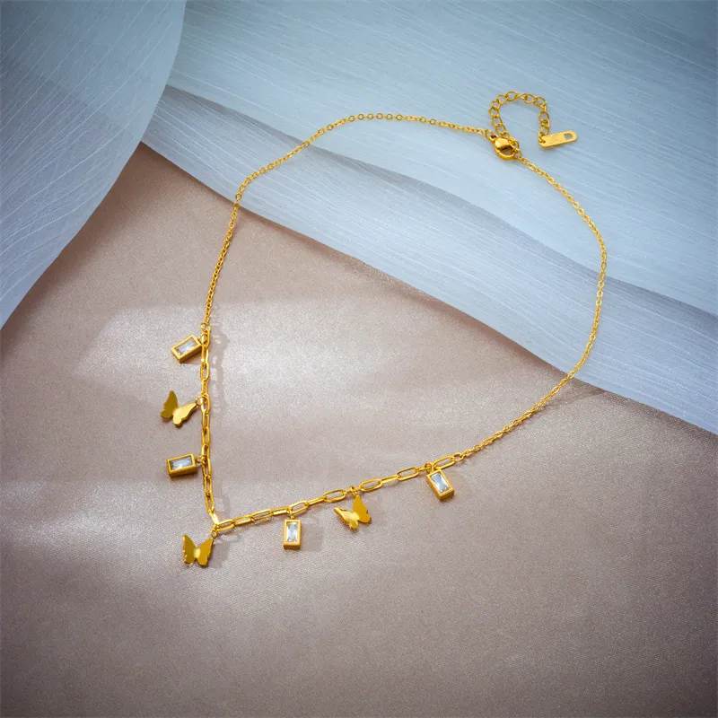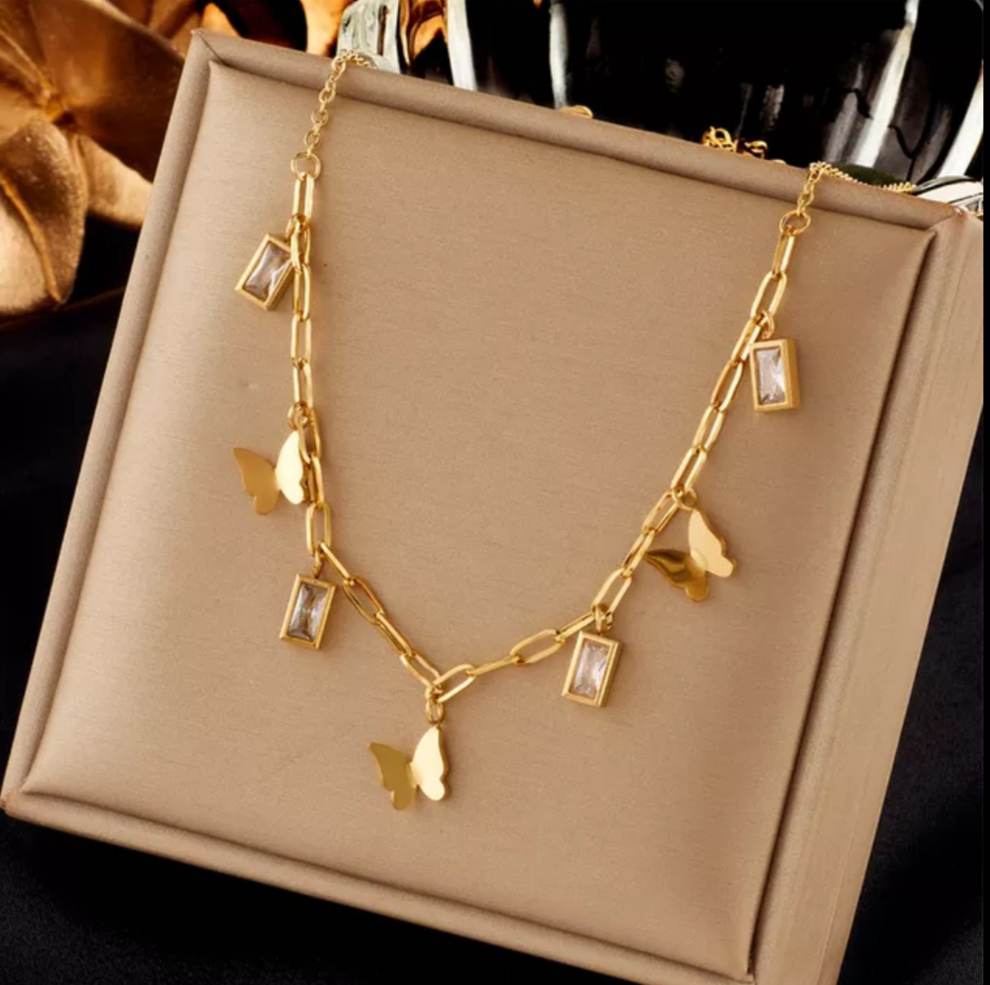 Collar en cero inoxidable con dijes de mariposa y piedras de Circonia Cubica